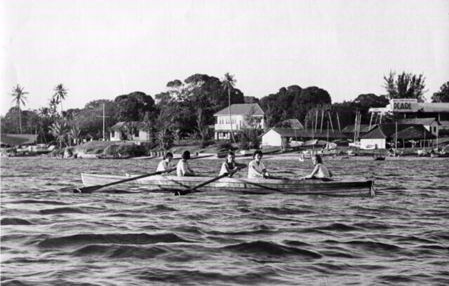 Picture provided by Tina. Mombasa 1960. Tina is pictured in stroke seat of the bow coxed clinker boat.
